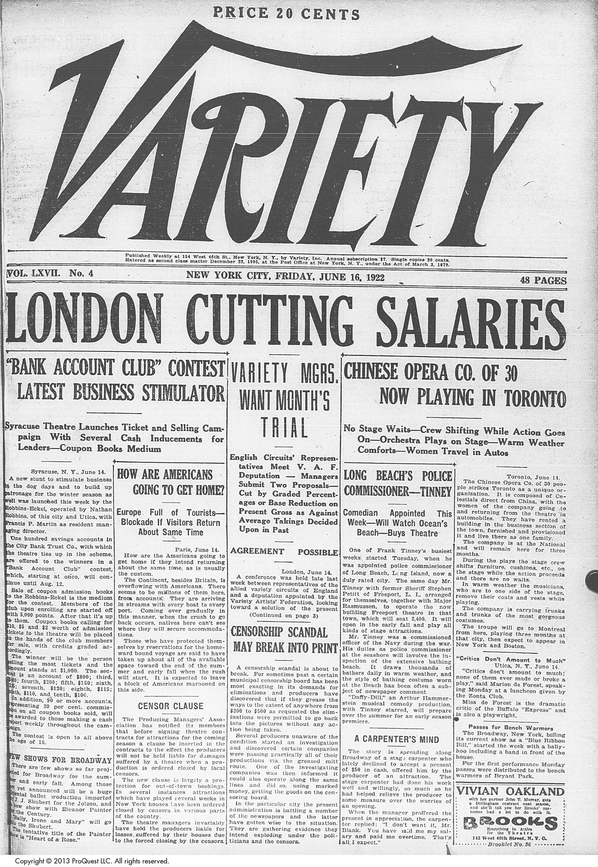 “Chinese Opera Co. of 30 Now Playing in Toronto.” Variety 16 June 1922: 1. ProQuest 5000. Web. 12 July 2015.